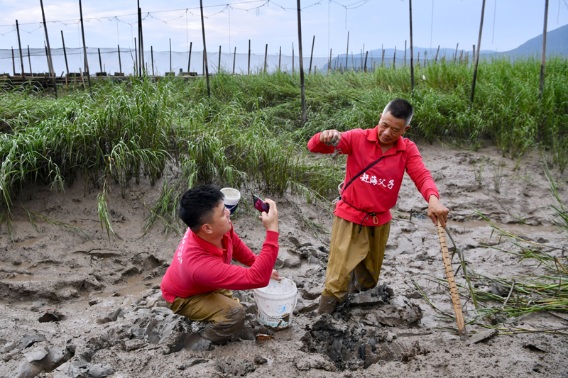 在福建宁德霞浦县沙江镇沙江村,张序剑(左)在滩涂上拍摄父亲赶海(2021年8月13日摄)。新华社记者 姜克红 摄