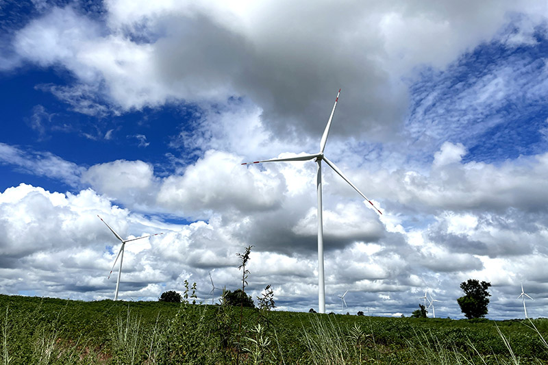 这是2022年10月4日在泰国猜也蓬府拍摄的由中国金风科技提供的风力发电机。新华社记者 宋宇 摄