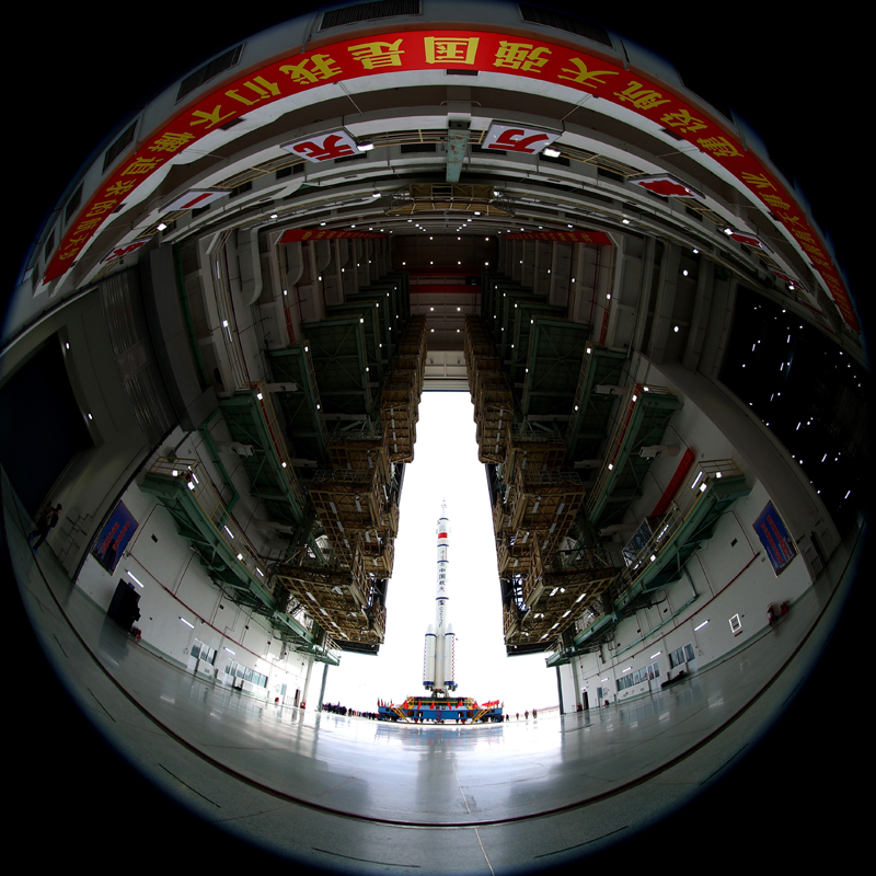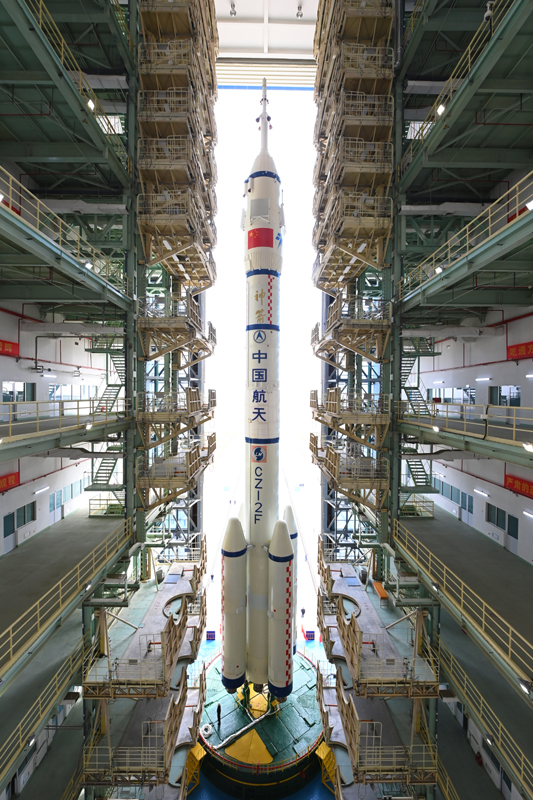 11月21日,神舟十五号载人飞船与长征二号F遥十五运载火箭组合体在转运途中。新华社发(李昀锡 摄)