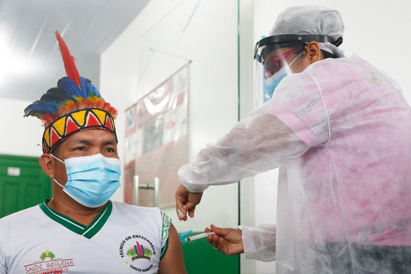医护人员在巴西亚马孙州塔巴廷加市为一名原住民接种中国新冠疫苗(2021年1月19日摄)。新华社发(卢西奥·塔沃拉 摄)