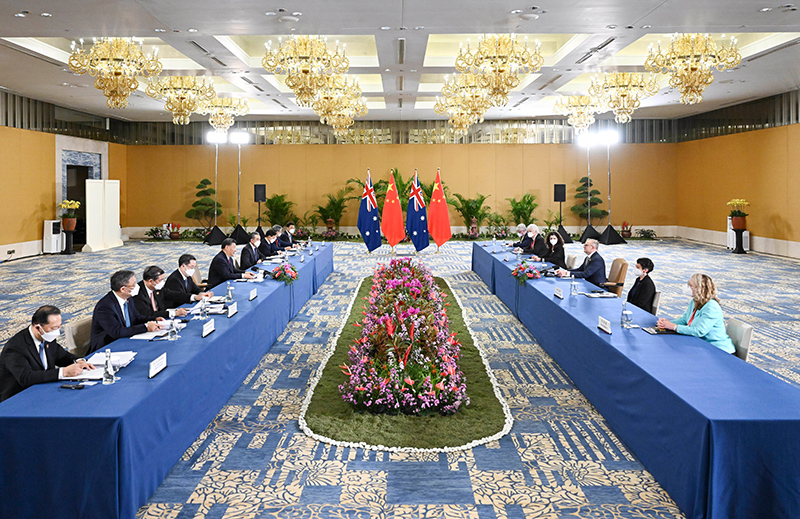 习近平强调,今年是中澳建交50周年。两国关系走向成熟稳定,首先应体现在正确看待彼此的差异和分歧。要超越分歧,相互尊重,互利共赢,这是两国关系实现稳定发展的关键。中澳之间从来没有根本利害冲突,有的是两国人民传统友谊和高度互补的经济结构,有的是维护联合国宪章宗旨和原则的共同诉求。中方重视澳方近期展现的改善和发展两国关系的意愿。双方应该总结经验教训,探讨如何推动两国关系重回正确轨道并可持续地向前发展。双方经贸合作潜力巨大,希望澳方为中国企业赴澳投资经营提供良好营商环境。