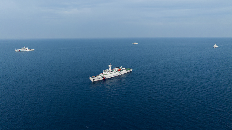 中国海警4304舰艇编队与越南海警8004舰艇编队沿中越北部湾分界线进行巡航(11月3日摄,无人机照片)。新华社发(骆天元 摄)