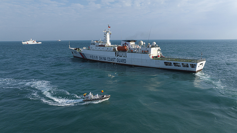 中国海警4304舰执法员在中越联合巡航期间使用信号旗对船只进行引导(11月4日摄)。新华社发(骆天元 摄)