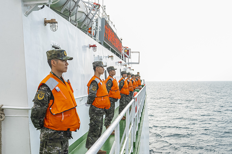 中国海警执法员列队欢迎越南海警舰艇参加北部湾海域联合巡航(11月3日摄)。新华社发(骆天元 摄)