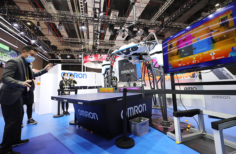 在第三届中国国际进口博览会期间,一名男子体验与欧姆龙公司的一款乒乓球教练机器人对战,右侧屏幕上实时显示他的心率和情绪指数(2020年11月5日摄)。新华社记者 方喆 摄