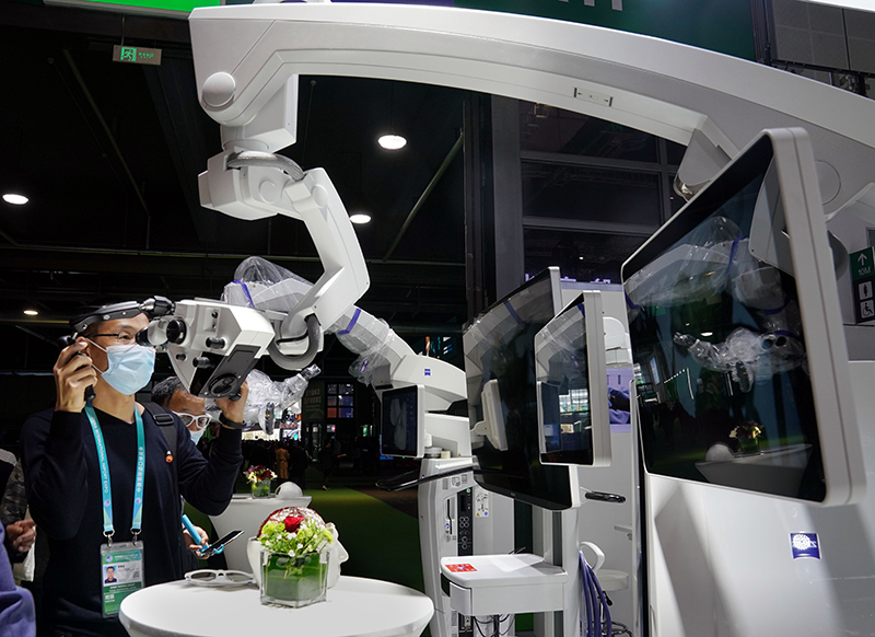 在第三届中国国际进口博览会医疗器械及医药保健展区蔡司集团展台,参观者体验手术显微镜(2020年11月6日摄)。新华社记者 刘颖 摄