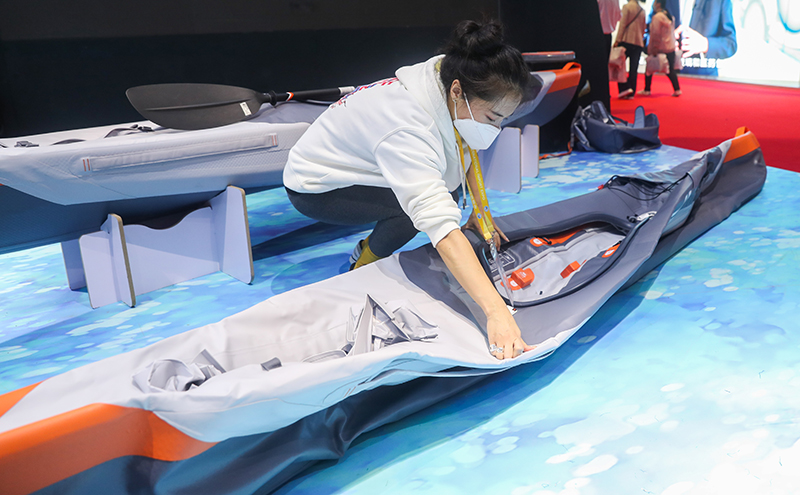 工作人员在第三届中国国际进口博览会消费品展区的迪卡侬展台演示可折叠皮划艇如何安装(2020年11月6日摄)。新华社记者 丁汀 摄