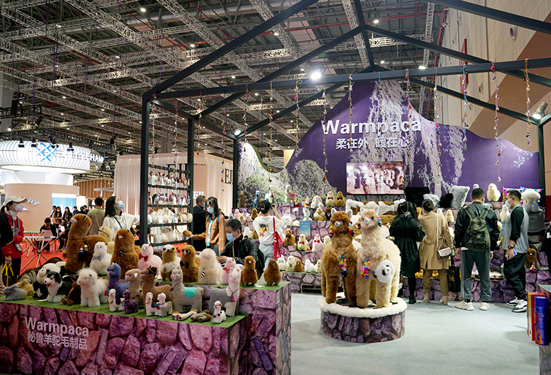 第四届中国国际进口博览会消费品展区的秘鲁羊驼毛玩偶展台(2021年11月6日摄)。新华社记者 刘颖 摄
