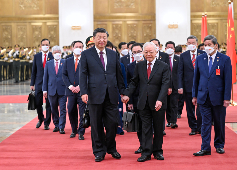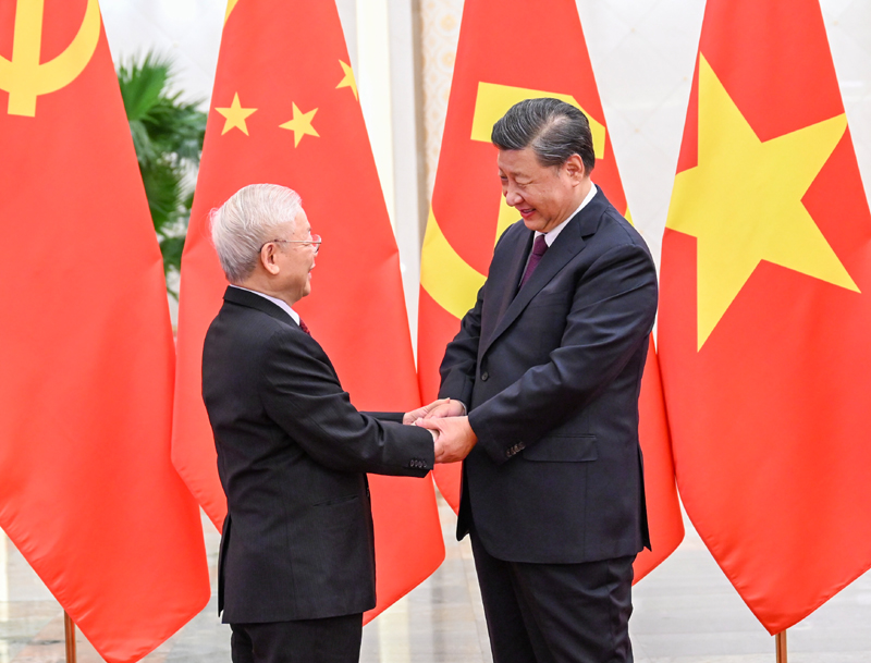 习近平热烈欢迎阮富仲在中共二十大召开后即对中国进行正式访问。习近平表示,近年来,我同阮富仲总书记同志通过多种方式保持密切沟通,就引领中越关系发展达成许多重要共识,这些共识得到全面落实,取得显著成效。