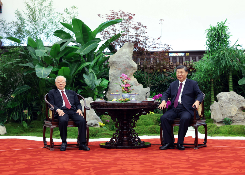 习近平指出,中越是山水相连、唇齿相依的好邻居、好朋友,是志同道合、命运与共的好同志、好伙伴,是致力于人类和平与进步事业的命运共同体。在两国推进社会主义现代化建设征程上,中国共产党愿同以阮富仲总书记为首的越南共产党一道,传承好毛泽东、胡志明等两党两国老一辈领导人亲手缔造和精心培育的传统友谊,共同引领中越关系取得更大发展。