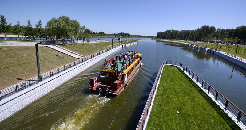 2022年6月24日,京杭大运河京冀段全线62公里实现游船通航。这是载着北京游客和建设者代表的游船通过船闸进入京杭大运河河北段。新华社记者 李欣 摄