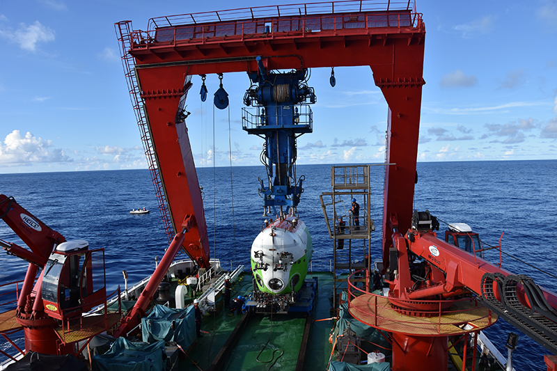 2021年8月18日,工作人员在西太平洋准备从“探索一号”科考船甲板布放“奋斗者”号。新华社记者 陈凯姿 摄