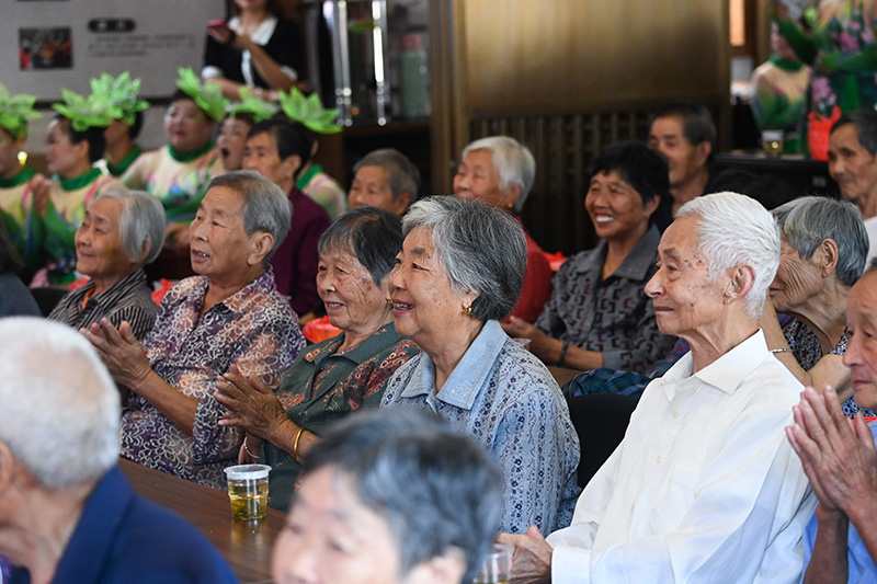 2022年9月30日,老人们在杭州市临安区河桥镇河桥村文化礼堂观看“柳溪暖阳”党员助老志愿服务队编排的节目。新华社记者 徐昱 摄