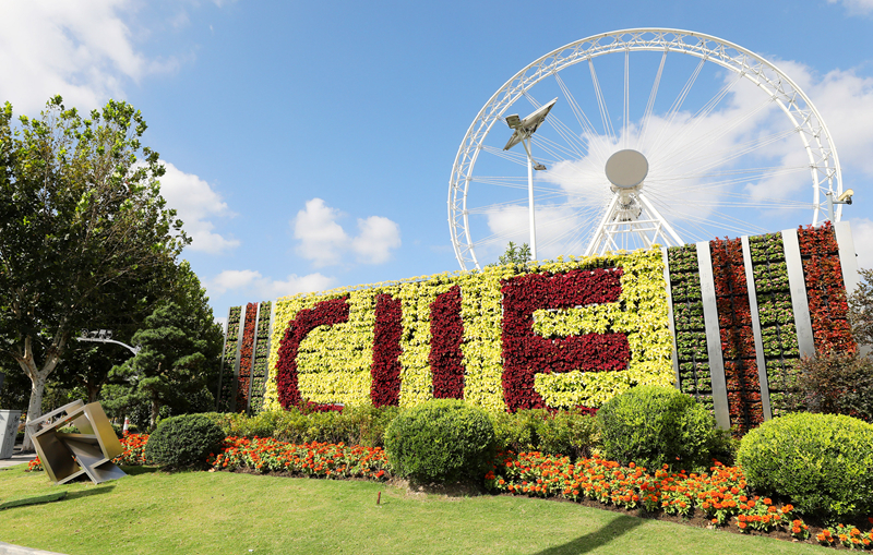 这是国家会展中心(上海)周边的进博会主题绿化装饰(2021年10月5日摄)。新华社记者 方喆 摄