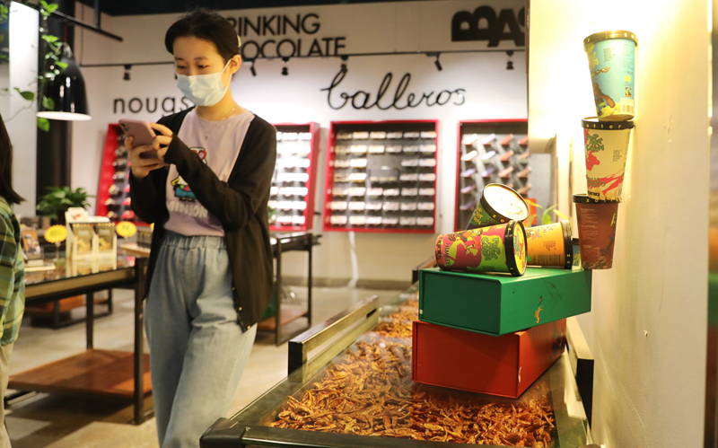游客走在位于上海杨浦滨江的奥地利珍得巧克力剧院商店内(2022年9月24日摄)。在即将开幕的第五届进博会上,珍得巧克力除了扩大展位面积外,也将为中国市场带来更多全新口味的巧克力。新华社记者 方喆 摄