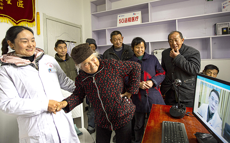 安徽省金寨县大湾村村民方临芳(前左二)指着自己身体疼痛的部位,在村医袁玲(左一)的帮助下向5G远程医疗会诊的专家讲述病情(2020年12月3日摄)。新华社发(陈力 摄)
