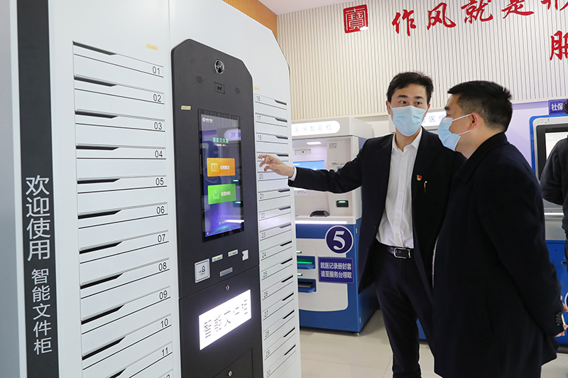 上海市闵行区七宝镇社区事务受理服务中心的工作人员(左)向前来办事的居民介绍智能文件柜的使用方法(2021年3月3日摄)。新华社记者 方喆 摄