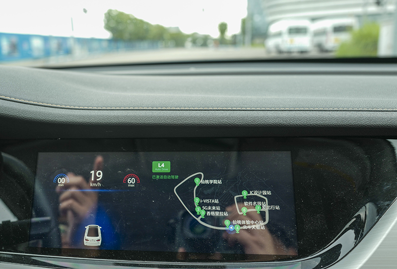 一辆L4级自动驾驶汽车在自动驾驶模式下,沿着重庆仙桃国际大数据谷示范运营线路的开放城市道路进行自动驾驶模式行驶测试(2019年7月24日摄)。新华社记者 刘潺 摄
