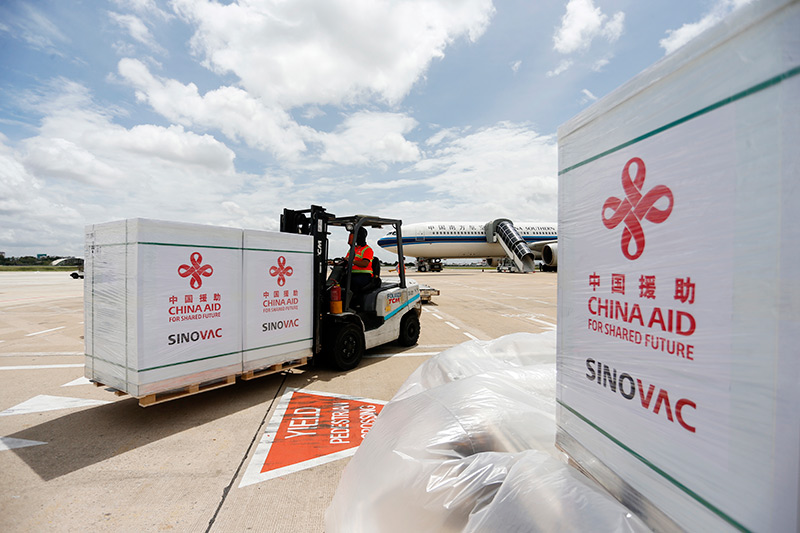 2021年10月14日,工作人员在柬埔寨金边国际机场运输中国政府援助柬埔寨的科兴新冠疫苗。新华社发(批隆 摄)