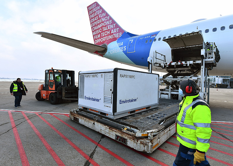 2021年1月16日,在塞尔维亚首都贝尔格莱德,机场工作人员卸载由中国国药集团生产的新冠疫苗。新华社发(普雷德拉格·米洛萨夫列维奇 摄)