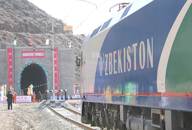 2016年2月27日,一列专列停在乌兹别克斯坦安格连-帕普铁路卡姆奇克隧道进口。新华社记者 沙达提 摄