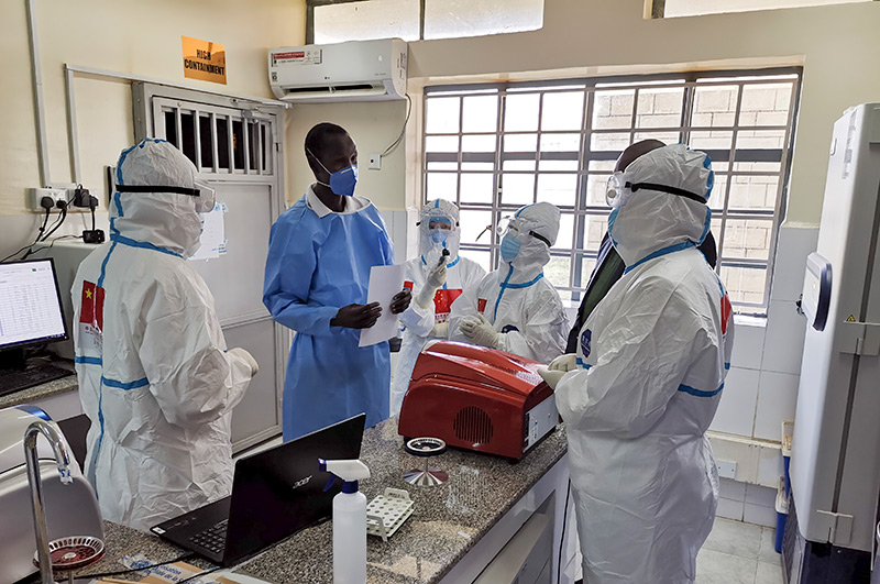 2020年8月21日,在南苏丹首都朱巴的一处新冠病毒检测机构,中国抗疫医疗专家组成员与当地医护人员交流。新华社发(中国驻南苏丹大使馆供图)