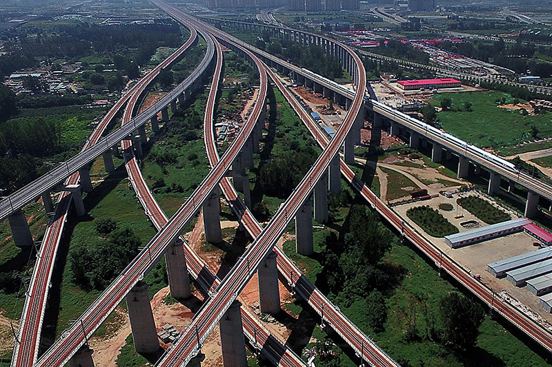 这是郑州东站附近一处京广、徐兰高铁交汇的立体枢纽(2016年9月1日摄,无人机照片)。新华社记者 李安 摄