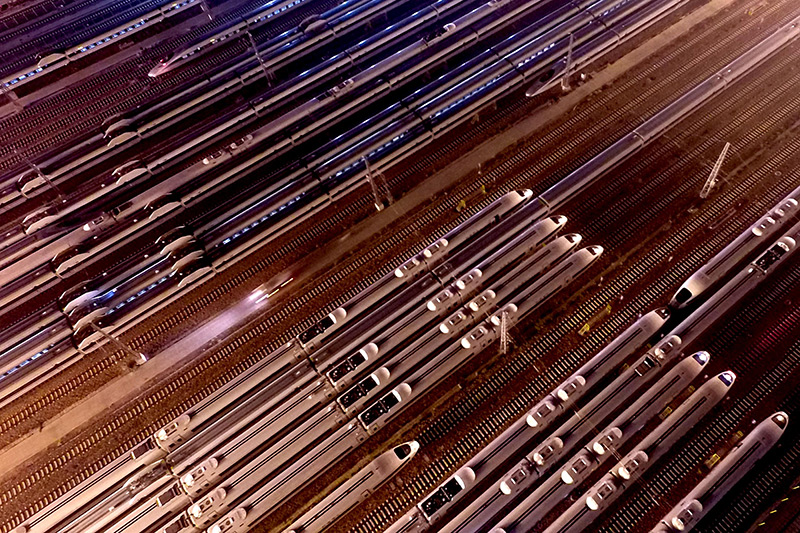 动车组列车停靠在郑州动车段停车场(2016年9月6日摄,无人机照片)。新华社记者 李安 摄