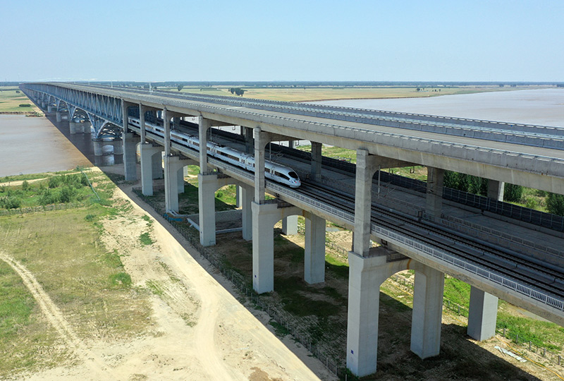 济郑高铁G9202次列车在万滩黄河公铁大桥上行驶(2022年6月20日摄,无人机照片)。新华社记者 李嘉南 摄