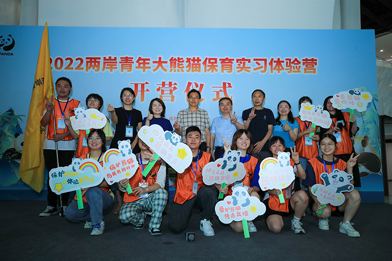 参与“2022两岸青年大熊猫保育实习体验营”的两岸青年在开营仪式上合影(2022年7月11日摄)。新华社发(成都大熊猫繁育研究基地供图)