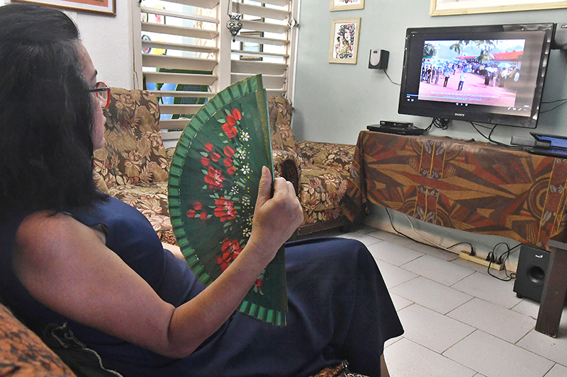 9月22日,在古巴首都哈瓦那,古巴电影制片人伊莉安娜·普波观看西班牙语中国纪录片《我的乡村故事》。新华社发(华金·埃尔南德斯 摄)