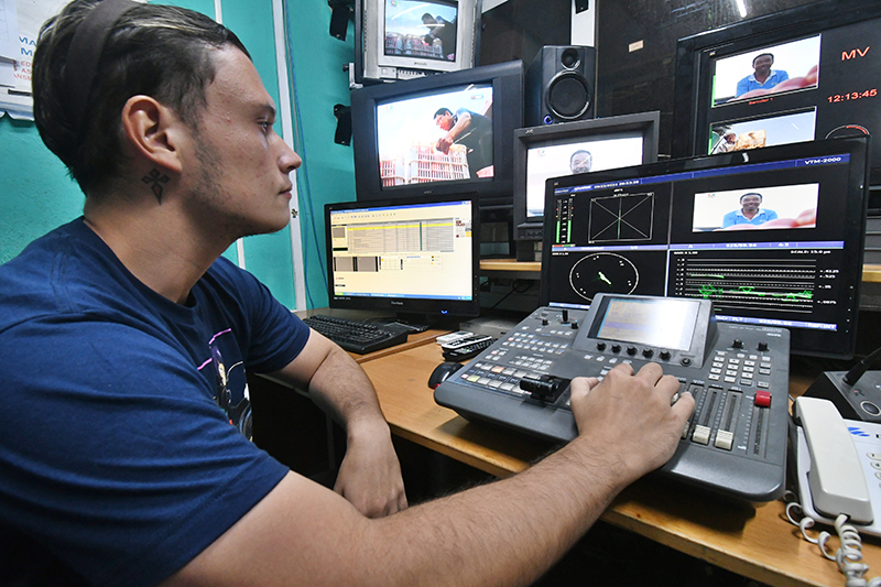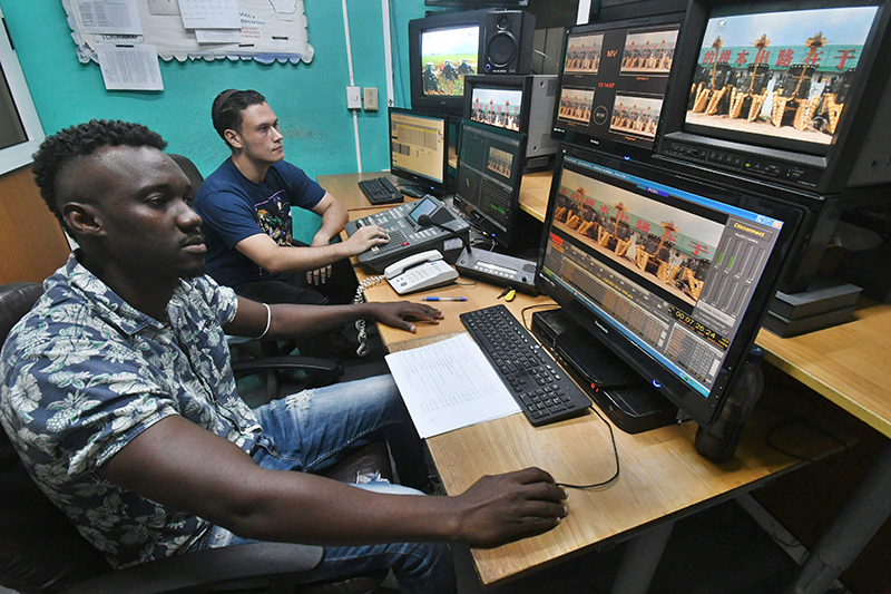 9月22日,在古巴首都哈瓦那,古巴国家电视台多视觉频道的技术人员在演播室准备播放中国纪录片《我的乡村故事》。新华社发(华金·埃尔南德斯 摄)