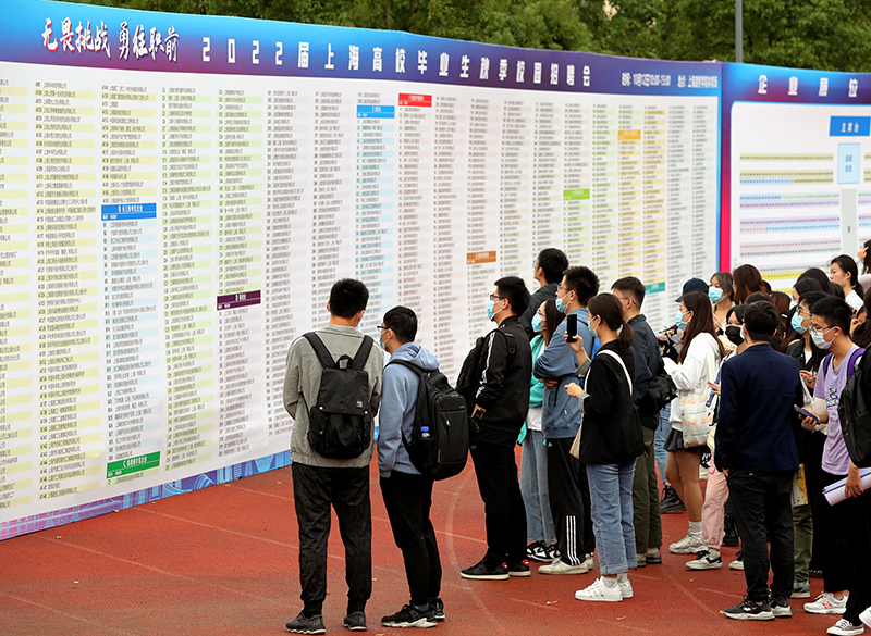 毕业生在2022届上海高校毕业生秋季校园招聘会上了解岗位信息(2021年10月12日摄)。新华社记者 刘颖 摄