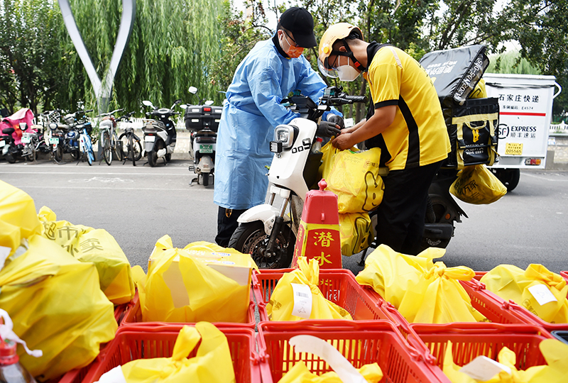 在河北省石家庄市裕华区一家超市保供点,外卖人员在打包,准备为市民送货(2022年8月30日摄)。新华社记者 杨世尧 摄