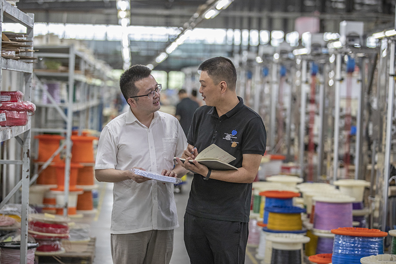 在重庆长秦汽车配件有限公司,重庆市璧山区高新区管委会的工作人员(右)在后工序车间内实地走访,了解企业遇到的困难(2022年7月19日摄)。新华社记者 黄伟 摄