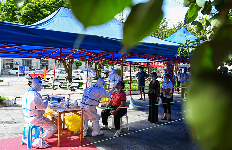 防疫人员在云南省瑞丽市友谊社区为居民进行核酸检测(2021年7月8日摄)。新华社记者 王冠森 摄