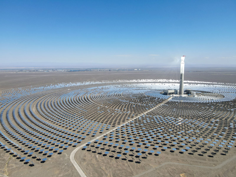 在新疆伊吾县淖毛湖镇拍摄的哈密50兆瓦熔盐塔式光热发电站(2021年8月22日摄,无人机照片)。作为新疆第一座光热发电站,哈密50兆瓦熔盐塔式光热发电站不仅污染物零排放,还通过储存热能实现24小时持续发电。新华社记者 高晗 摄