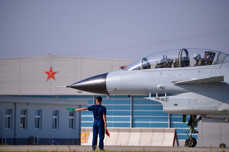 在空军石家庄飞行学院某旅机场,空军首批三代机飞行学员驾驶首批列装空军院校的歼-10战机准备起飞(2021年9月10日摄)。新华社发(李敏 摄)