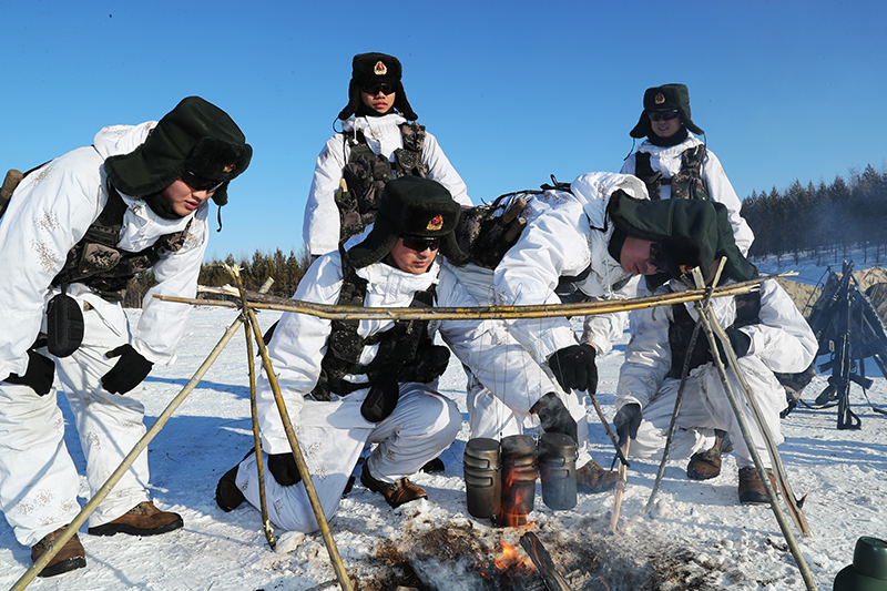 驻北疆某边防部队官兵使用军事科学院系统工程研究院某所研制的某型多功能保温水壶进行野外烧水煮饭试验(2019年1月23日摄)。新华社发(匡小文 摄)