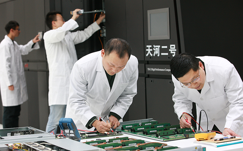 国防科技大学计算机学院计算机研究所科研人员在天河机房,测试“天河二号”超级计算机系统(2019年2月25日摄)。新华社发(何书远 摄)