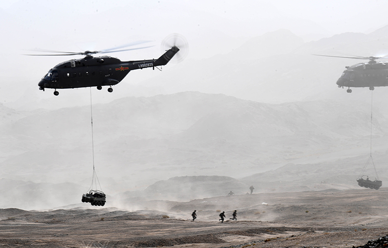 陆军练兵备战及转型建设集训中,某空中突击旅进行实兵实弹演练(2018年5月23日摄)。新华社记者 张永进 摄