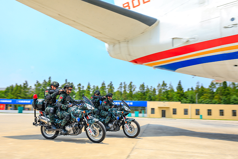 武警上海总队机动第一支队特战某中队组织交通工具反劫持综合演练,特战队员乘坐摩托车接近“被劫持飞机”(2022年8月1日摄)。新华社发(李岩 摄)