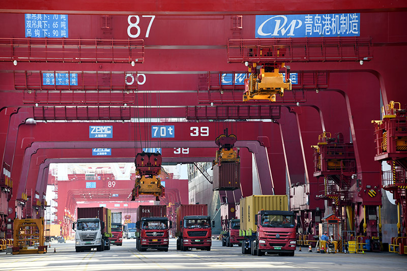 货车在山东港口青岛港前湾三期集装箱码头运送集装箱(2022年9月10日摄)。新华社记者 李紫恒 摄