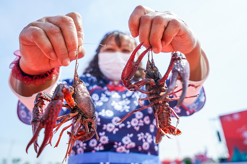 在江苏省淮安市盱眙县举行的第22届中国·盱眙国际龙虾节开捕仪式活动现场,农业工人展示小龙虾(2022年5月18日摄)。新华社记者 李博 摄