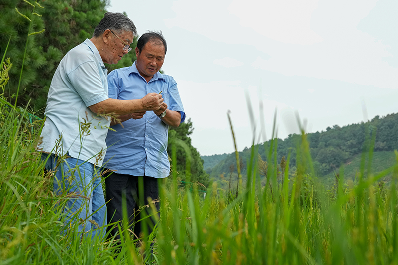 赵亚夫(左)在江苏省句容市天王镇戴庄村查看水稻长势(2022年9月9日摄)。新华社记者 李博 摄