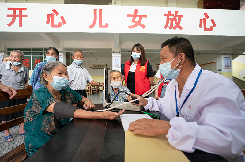 在江西省新余市分宜县杨桥镇建陂村“颐养之家”,驻村医生在为老人测量血压(9月14日摄)。新华社发(赵春亮 摄)