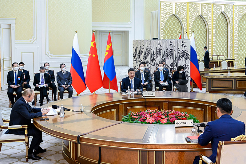 当地时间9月15日下午,国家主席习近平在撒马尔罕国宾馆同俄罗斯总统普京、蒙古国总统呼日勒苏赫举行中俄蒙三国元首第六次会晤。新华社记者 翟健岚 摄