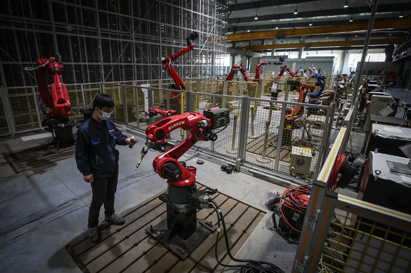 2022年4月28日,新松机器人自动化股份有限公司的工作人员在生产车间内调试机器人。新华社记者 潘昱龙 摄