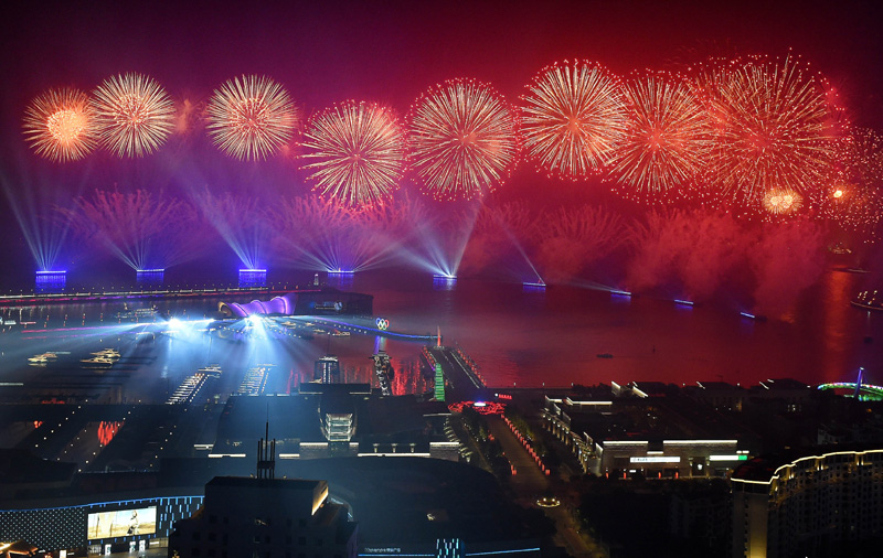 这是2018年6月9日晚在青岛举行的《有朋自远方来》灯光焰火艺术表演。2018年6月9日至10日,上海合作组织成员国元首理事会第十八次会议在青岛召开。新华社记者 李紫恒 摄