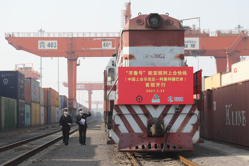 胶州海关关员对“齐鲁号”欧亚班列上合快线(中国上合示范区——阿塞拜疆巴库)线路首班列车进行检查(2021年1月31日摄)。新华社发(解豪 摄)